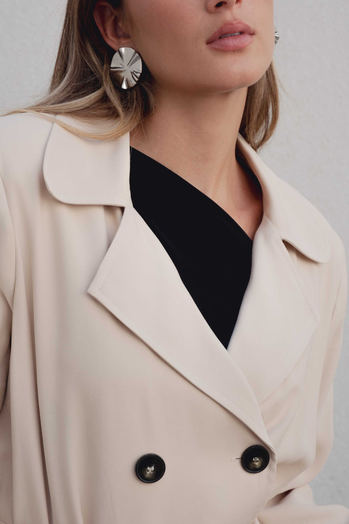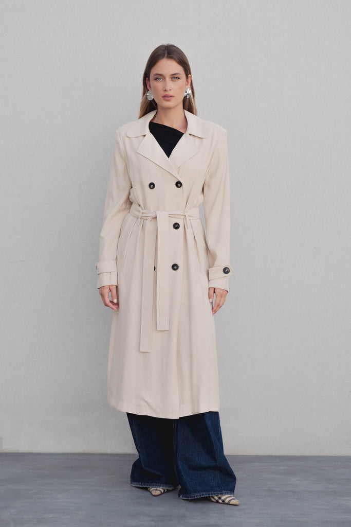 Trench oversize de corte moderno, con cuello solapa y manga larga. Presenta trabillas con botón en las mangas, bolsillos delanteros prácticos y un cinturón ajustable en el mismo tejido con elegantes lazadas. El bajo acabado incluye una apertura en la espalda para mayor comodidad y movimiento, mientras que el cierre frontal se mantiene discreto gracias a los botones ocultos bajo solapa.